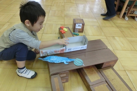 森の組のワニが 列車を食べようとしている。