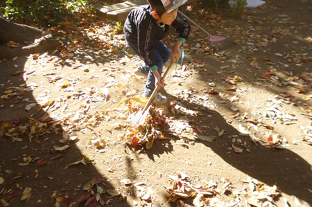 コートの落ち葉を掃く子ども。