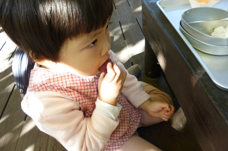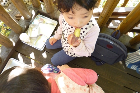 晩秋のツリーハウスでお芋をほおばる
