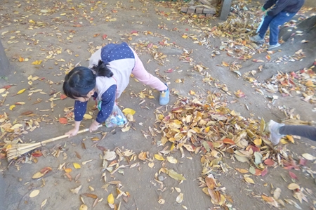 コートの落ち葉を掃く子ども。