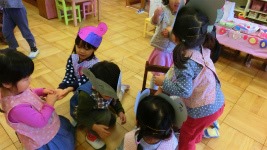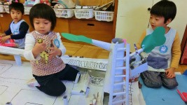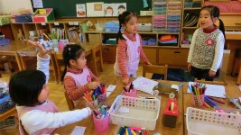身体の中から動かして 2015.11.19 2015 11/19 2015年11月19日 身体の中から動かして 2015.11.19 「おむすびころりん すっとんとん!」 「きのうのおむすび、おいしかった!」 昨日の充実が 今日を繋ぐ。 雨上がりの幼稚園。 それぞれの遊びが 始まる。 誕生会の ♪きりんさん♪。 昨年のは小さくなっちゃったので 作り直したそう。 いつのまにか 大きくなる 小さな子どもたち。 目には見えないけれど、 外側だけでない、 その中身の成長を感じる 朝。 続きの ごっこ遊びに 紙芝居作りが加わった 海の組。 「読む順番を決めておこう!」 「ねぇ、何番にする?」 川の組も ジオラマの世界に 新しい動物たちが 加わるらしい。 それぞれが いろんなことを 思いつく。 相手の思いつきを、 それいい考えだね と 真似したりする。 自分の考えていることと 相手の考えに相異があると 「ちがう!」といっていた人が、 「まだだよ。これを積んでから」 と言っている。 代弁してあげようと思ったら自分で言えた。 育ってきているのだ。 池の組は 昔話の世界。 ♪おむすびころりん♪が 楽しくて たまらない。 なりたい役がたくさんあるので 何度も 何度も 上演する。 この音楽劇の作曲者は あの有名な服部正先生。 子どもたちが こんなにも ご自分の作品に 熱中しているのを、 きっと、 お空の上から ニコニコ見ておいでに違いない。 浦島太郎も 三匹のこぶたも 文福茶釜も 服部先生の作品だ。 夢中で遊びながら、 いつのまにか 知らず識らず 創造性が培われていく。 幼児の生活は 一つひとつが リズミカルな表現。 生活のすべてに リズムがある。 歌っても 踊っても、 走っても 何かを製作しても、 それらがすべて 創造的な力になって、 子どもたちの身体に 蓄えられる。 目に見えない 子どもの中身を 育てるために、 私たちも 身体の中から動かして 生きていこうと思う―――。 t.youchien おにはそと!おにはそと! 小さい人たちのために鬼もこなす山の組。 豆まきの写真600枚、選ぶの大 【問題】何を作っているでしょう? 明日の幼稚園で欠かせないアレです。 お楽しみに。 ふふふふふ お休みしていた仲良したちが登園! みんな嬉しい幼稚園。 一緒に考え、共感し、折り合って遊ぶ子ども 長い、長〜〜〜いヘビ。 できあがったら、いろんなところに出かけよう。 「細いところに入れるよ!」 こんこんこ山は 雪ふりだ はととすずめの 雪がっせん ぽっぽっぽ! ちゅんちゅんちゅん! 身 昨日・今日でさらにパワーアップの、2階建てレストラン🍽️ 年長児を中心に、小さなものも粘り強く作り 作る、作る、作る子どもたち。 ボールを、電車を、人形を、お豆の箱を作ります。 お友だちの手伝いも ♪まりつきトン♪が止まらない。 神経を研ぎ澄ませて、「はずんでトン!」。 わぁ、Rくん600回! ♪グスタフス・スコール♪ に ♪すずめ♪ 外はぴゅーぴゅー寒いけど、お部屋のリズム遊びはいつも Instagramを開く 保育ドキュメンテーション 保育 こちらもどうぞ 建設的な幼稚園 創造性を 生きる力を いつもを豊かに 2016.09.28 高階幼稚園@川越・ふじみ野エリア リズミカルな生活 創造性を培うごっこ遊び 濃密な小脳活動を おいしいドラマ 2015.11.30 自由な保育 — 小さい人たちの生活 —