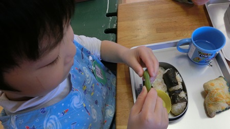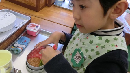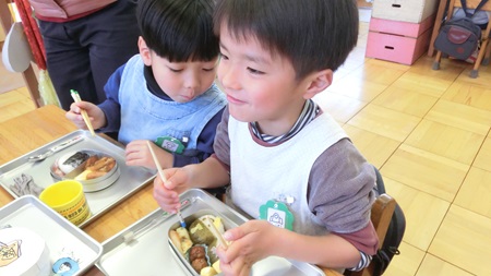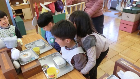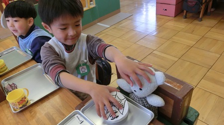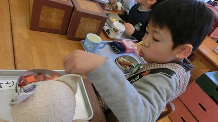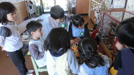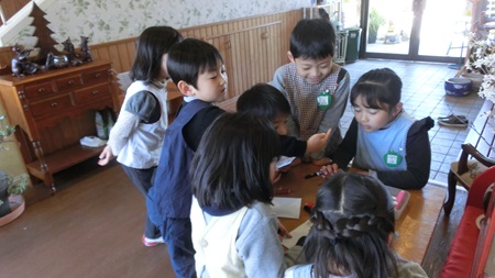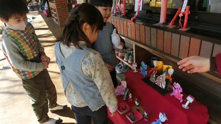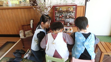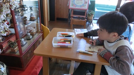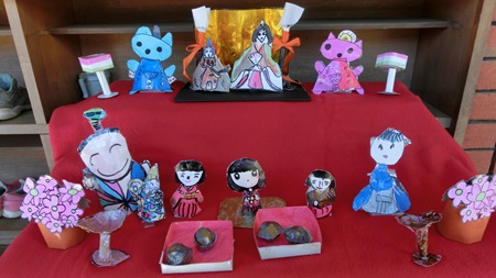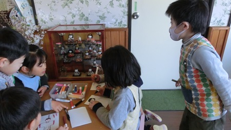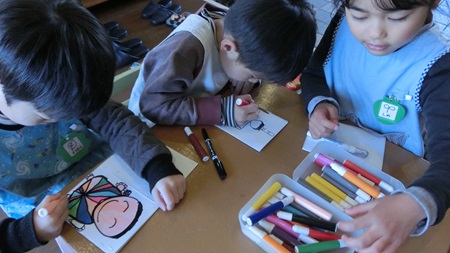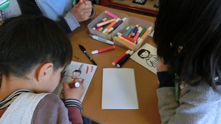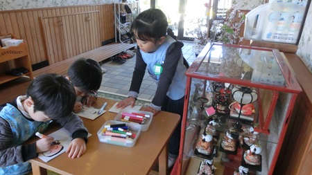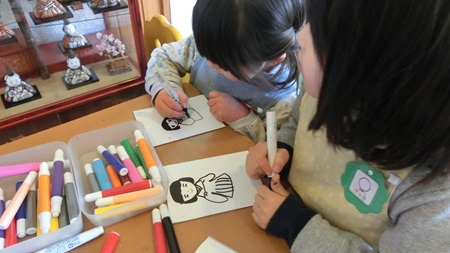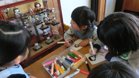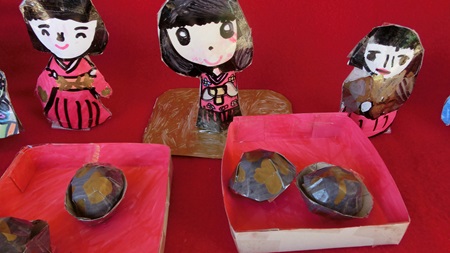 男児たちが 熱心に雛人形を作っている。