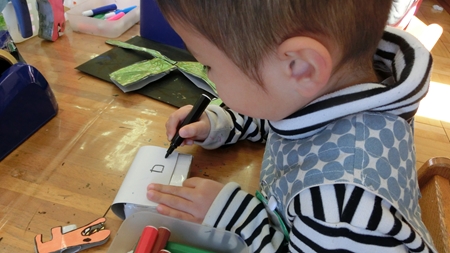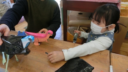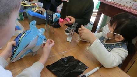 もう一人のきょうだい忍者は 作り物に夢中。